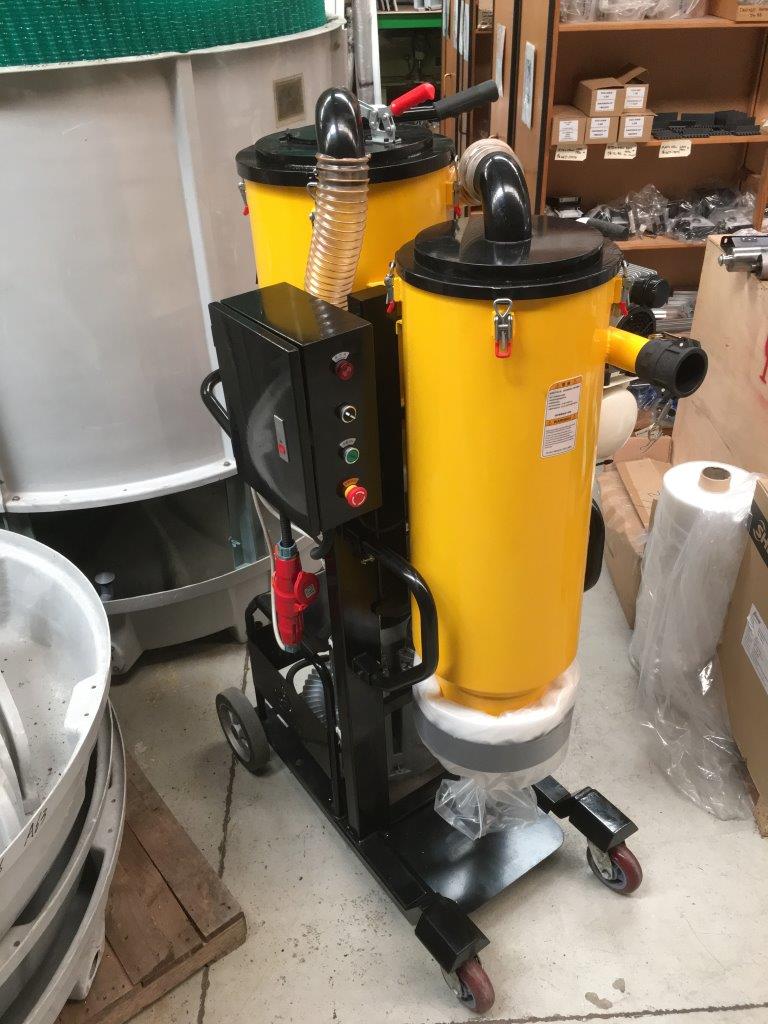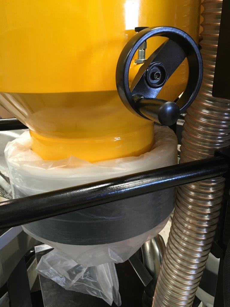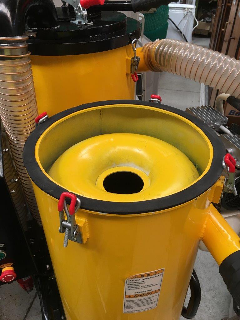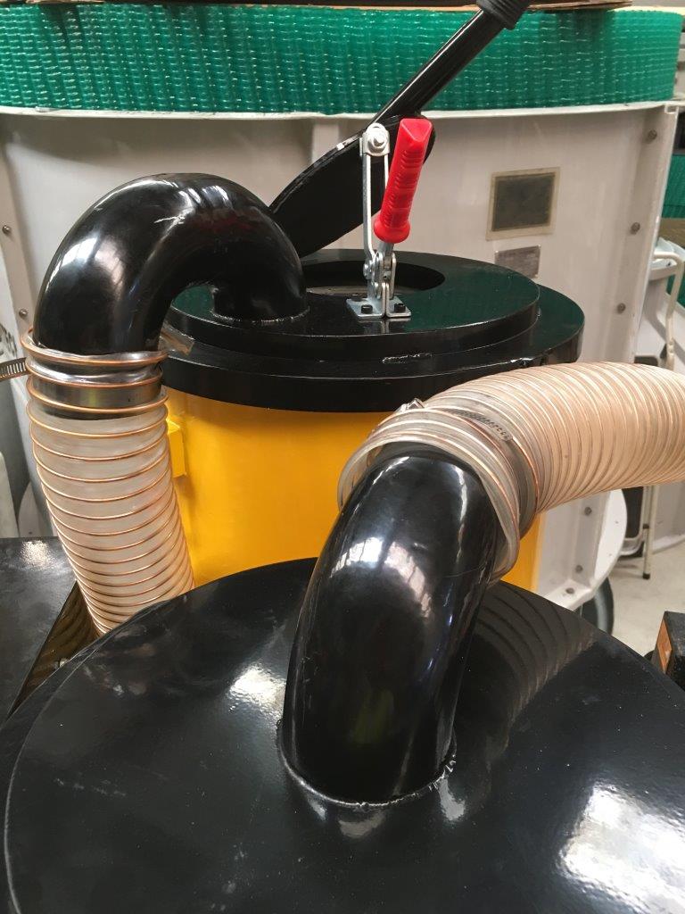 Then the vacuum is momentarily switched off the weight of the dust opens the pressure plate at the bottom of the cylinder and the debris drops into the Longo bag.