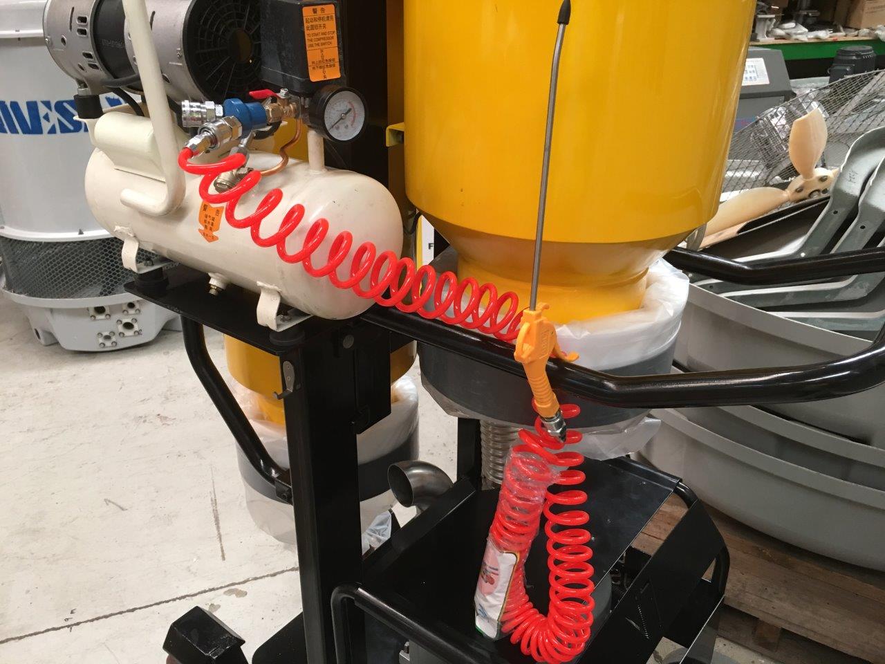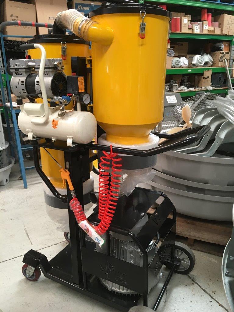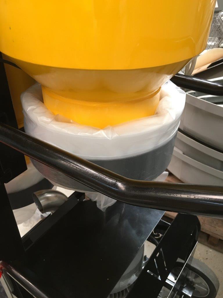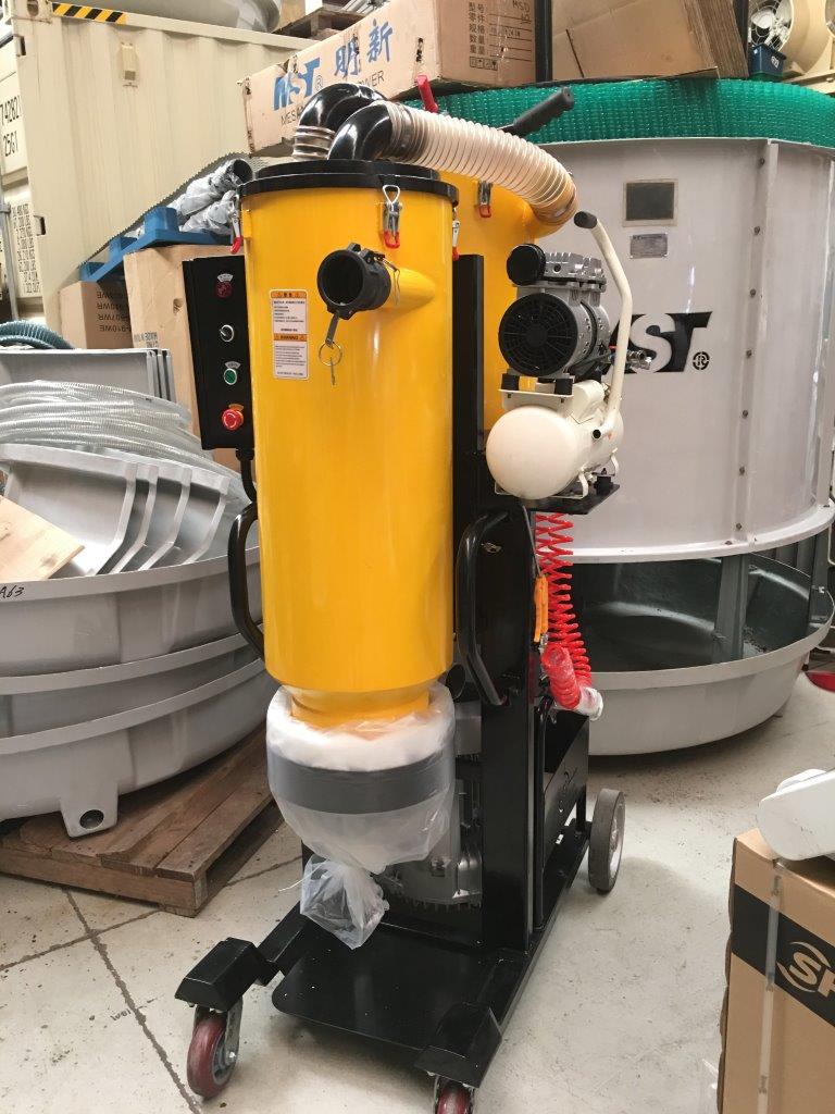 Then the vacuum is momentarily switched off the weight of the dust opens the pressure plate at the bottom of the cylinder and the debris drops into the Longo bag.
