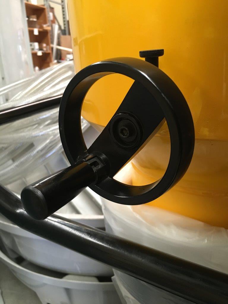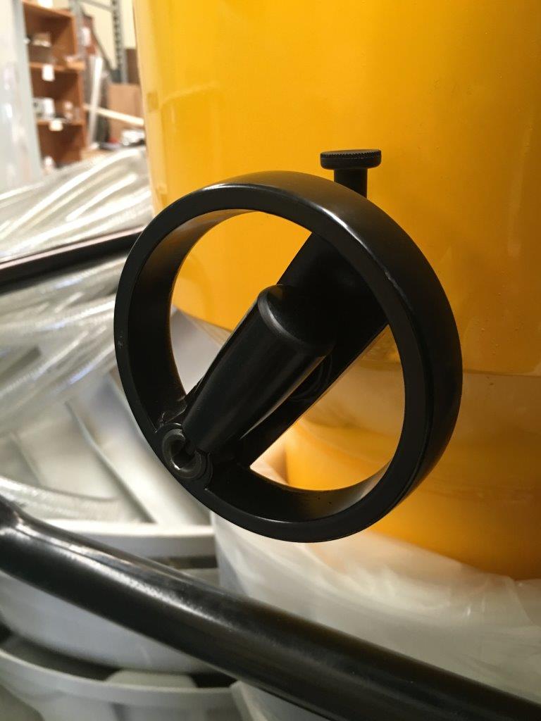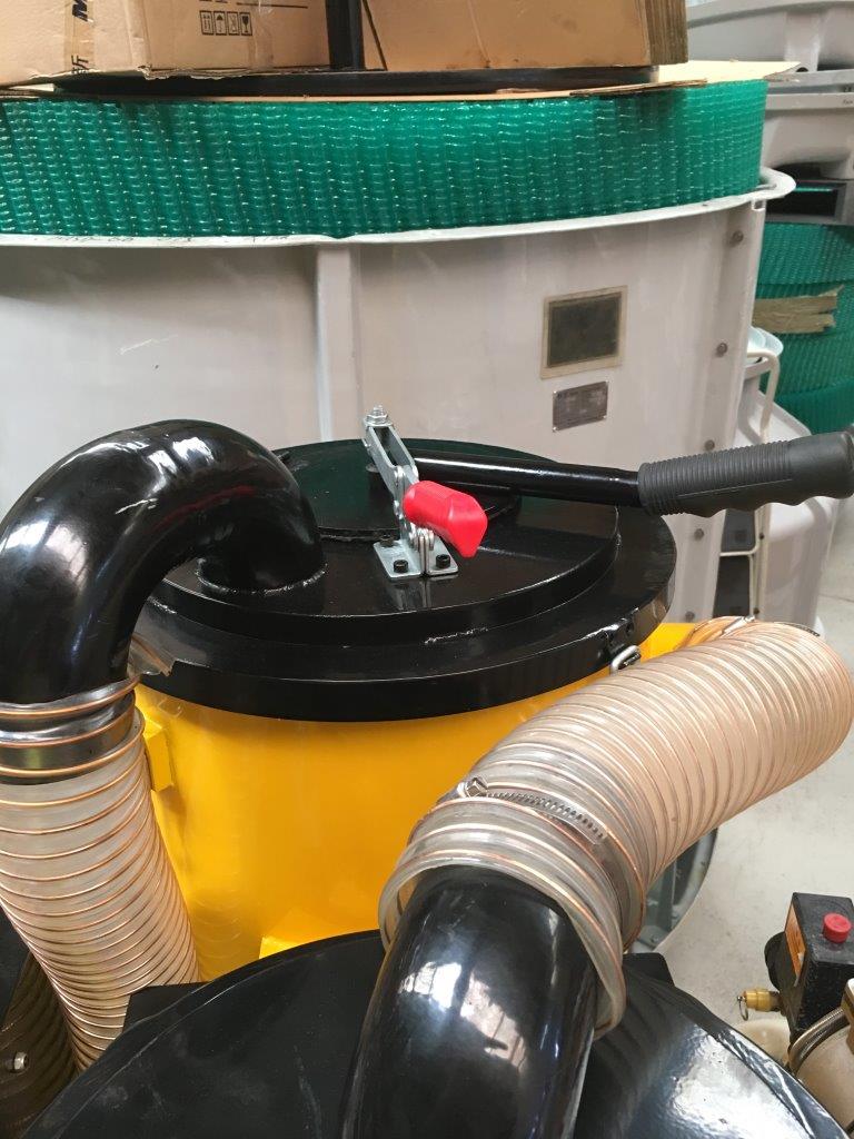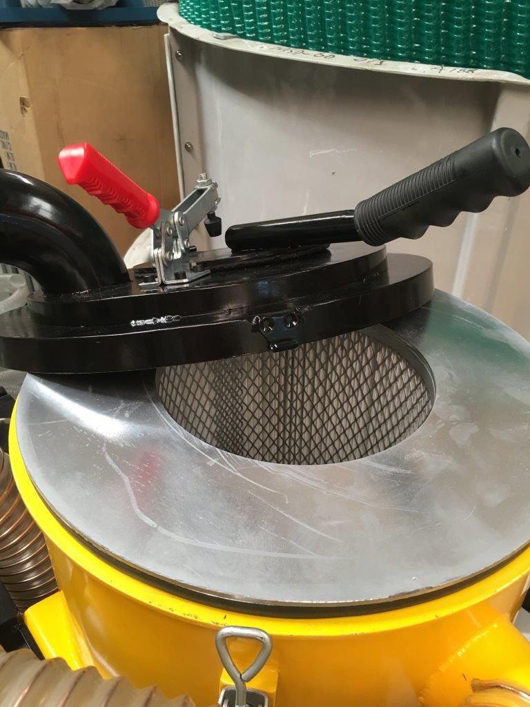 Continuing .. . the air steam with any residual dust enters the second chamber and is spun (cyclone) again to further reduce it. The then near clean air passes through a giant HEPA filter (see illustration) and is exhausted into the room. It is now 100% clean air. To empty the second chamber a crank handle beneath the chamber raises or lowers the base plate (like the bucket at the well) to allow that chamber to empty into a Longo bag also.